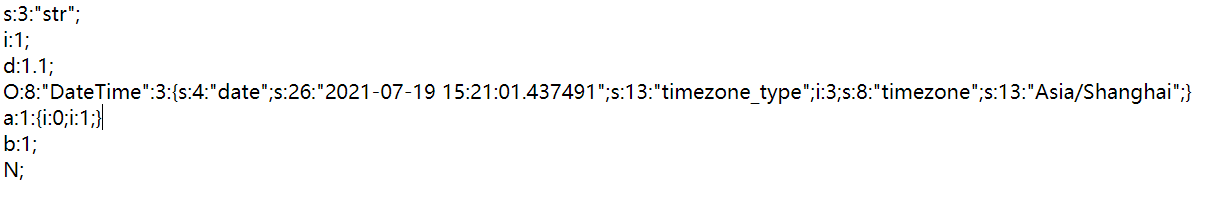 开头的一个字符代表类型,后面跟着一个冒号:用于分隔类型和值;对于字符串类型、变量名和类名,代表类型的字符后还跟着一个数字,用于描述后面字符串的长度;相同的,类对象和数组也存在一个数字用于描述类对象属性数量或数组长度,其中属性或数组内容用一对花括号括起来,花括号里可以嵌套其他类型的序列化内容 。