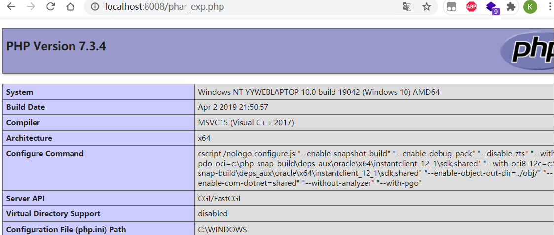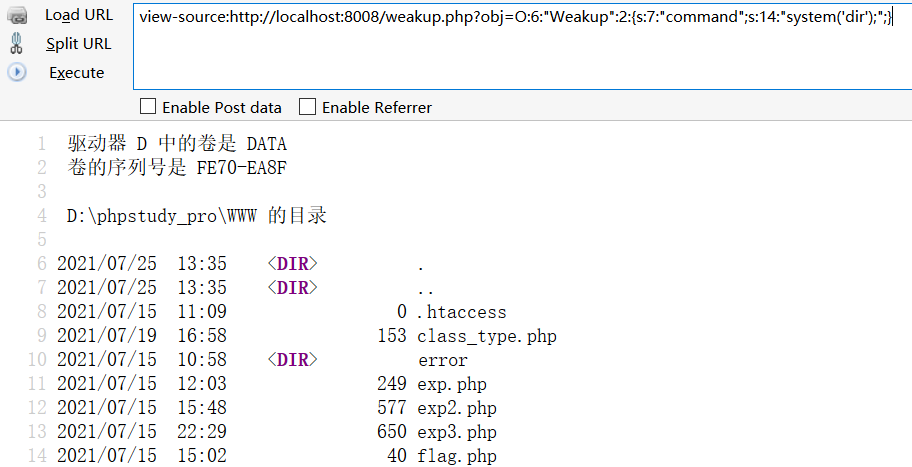 以上payload中,序列化字符串描述属性有两个,但实际只有一个,绕过了__wakeup,command参数没有被替换为phpinfo,执行了我们的dir命令。