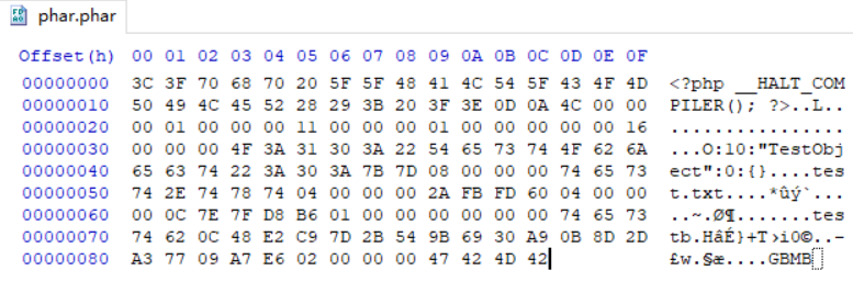 打开生成的phar归档文件,在里面可以看到序列化后的TestObject对象。