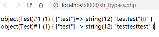 替换后长度由长变短,似乎需要至少两个属性可控才能逃逸字符串。第一个属性用于减少减短长度,第二字符串用于逃逸字符串,需要减少的长度为第一个属性的内容到第二个属性需要逃逸的字符串之间的距离。最终payload为以下内容。需要注意的是,长度减短后,test2属性就被吞掉了,逃逸时需要加一个属性使得属性数量为3,才能正常反序列化。由于php不存在的属性也能被反序列化的特殊,这里随便加个属性即可。