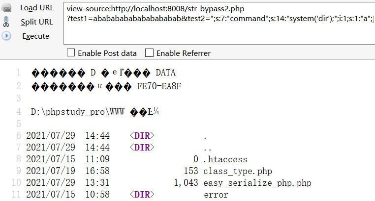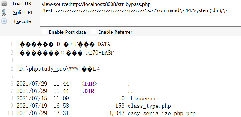 这个Demo的目的是要把commond属性替换为我们的命令,需要逃逸的字符串为";s:7:"command";s:14:"system('dir');";},替换前后的长度变化为由1变2,那令z的长度等于需要逃逸的字符串的长度即可,最终payload为: