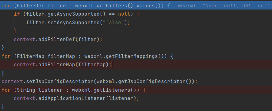 此时在web.xml中配置三大组件如下,并在configureContext方法处下段点即可开始调试。