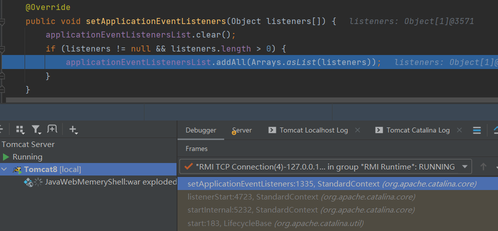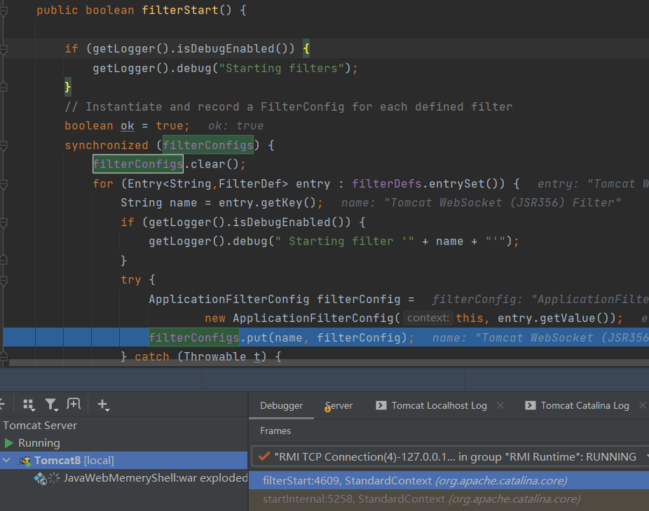 对这两个属性下断点,加载了web.xml配置后,StandardContext实例还分别调用listenerStart和filterStart方法,设置了上述两个属性,所以内存马最终也需要调用listenerStart和filterStart方法才完成Listener和Filter的加载。