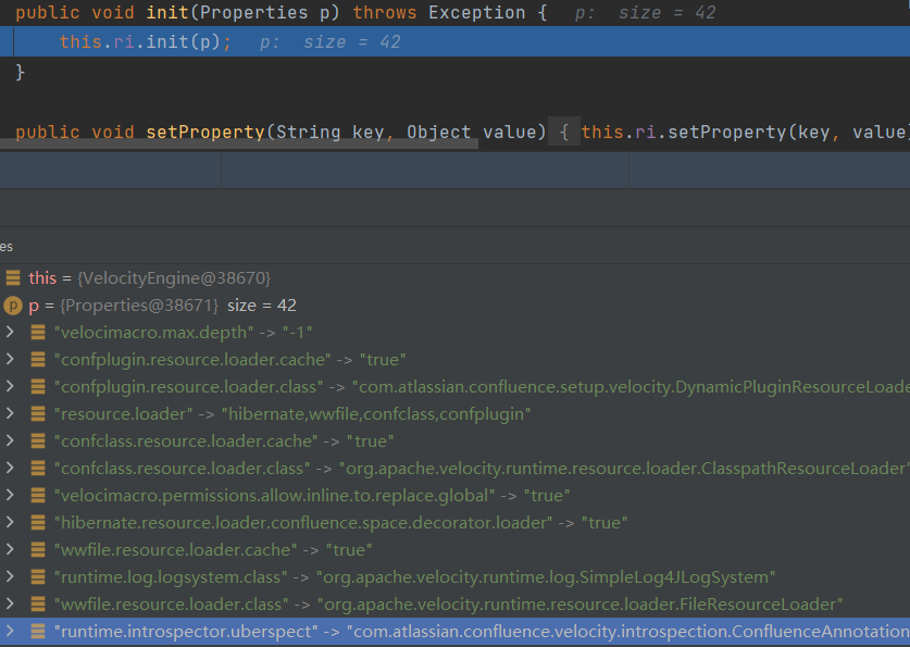 调试可以先从VelocityEngine的init方法下手。在init下断点,然后重新运行网站的启动脚本,用于初始化的Properties对象有很多的配置,其中runtime.introspector.uberspect是与沙箱相关的一个配置。其使用ConfluenceAnnotationBoxingUberspect类进行配置。