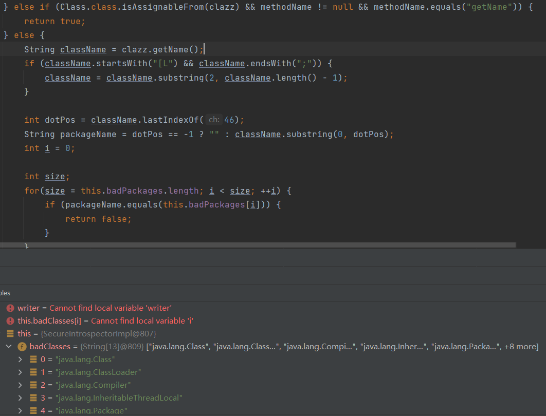 搜寻一番,发现是在SecureIntrospectorImpl的getMethod方法输出的日志。跟进到同一个类中的checkObjectExecutePermission方法,验证对象是否合法。常规模板注入获取Class实例,一般通过String类型的Class实例调用forName方法,也就是java.lang.Class已经在黑名单类内,所以这种方式在这里就无法使用了。
