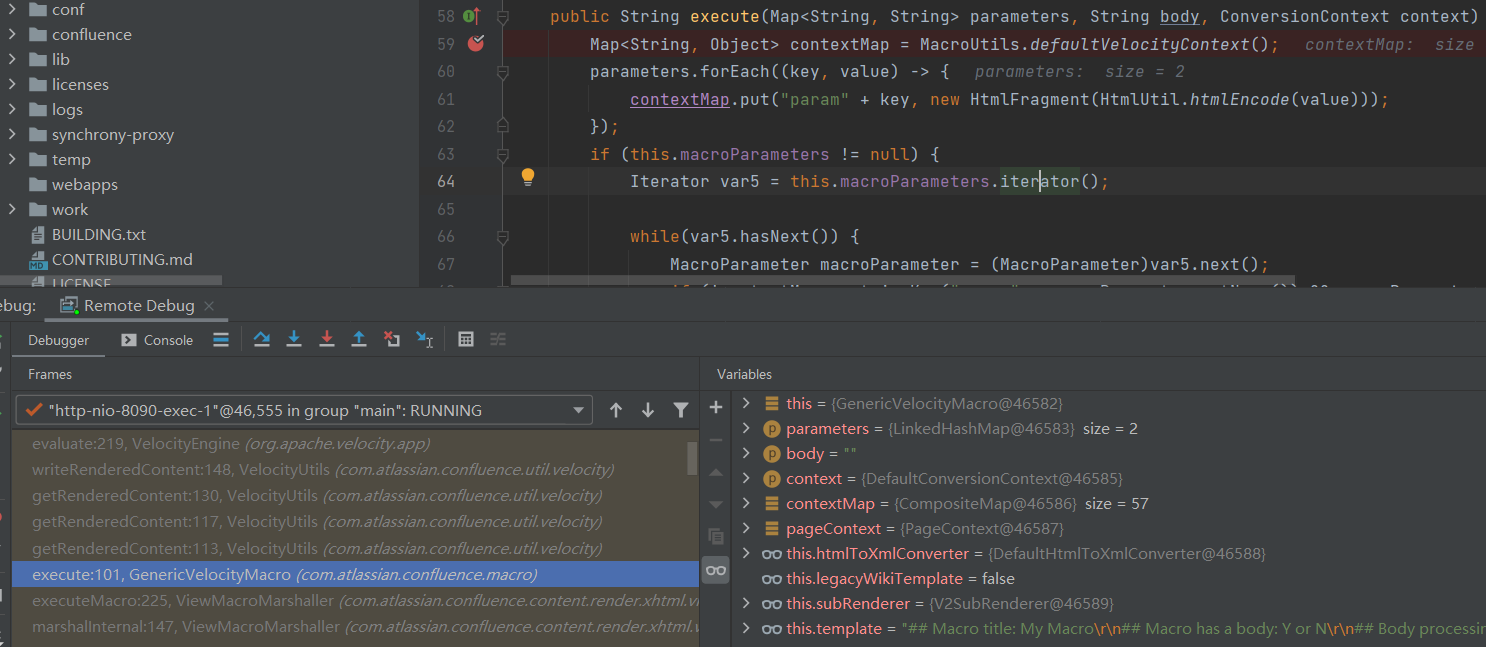 再回去看看CVE的描述,说是通过上下文绕过沙箱。接下来找找有哪些上下文属性,我这里在模板中执行String的codePointBefore方法并下断点。顺着调用栈往上找,在GenericVelocityMacro的execute方法里调用了MacroUtils的defaultVelocityContext方法。