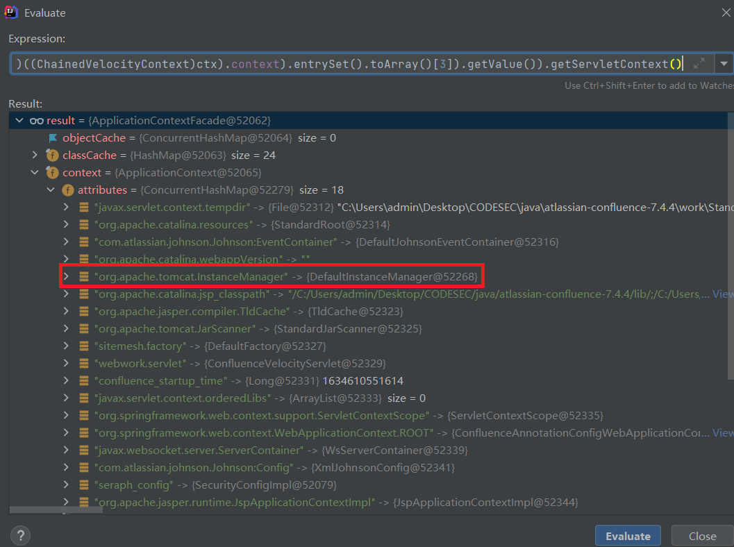 其中req做最终是实现ServletRequest接口的,具有getServletContext方法,可获得Servlet的上下文。而上下文中有attributes属性,其中包括org.apache.tomcat.InstanceManager的键值对,这个类名在Struts2的Poc中看过,可以通过newInstance方法new一个给定类名的实例。