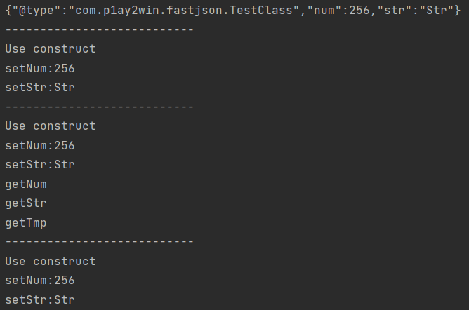 实验代码和运行结果如下,可以看到当反序列化的方法为parse和parseObject且传入参数为json字符串和Class实例时,会自动调用给定类的构造方法和setter方法;当放序列化方法为parseObject且只传入json字符串时,会调用给定类的构造方法、setter方法和全部的getter方法。