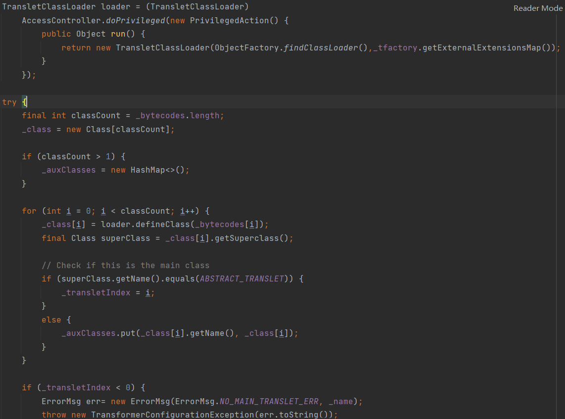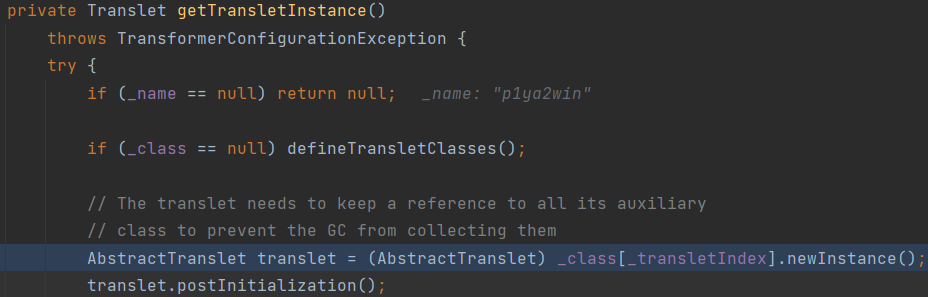 调用栈显示设置outputProperties而调用它的setter方法,接着再陆续调用newTransformer方法和getTransletInstance方法。主要的代码在getTransletInstance方法中,实例化_class数组里相应的Class实例。而_class数组我们是没有在json中设置的,它的赋值是在上面的defineTransletClasses方法。
