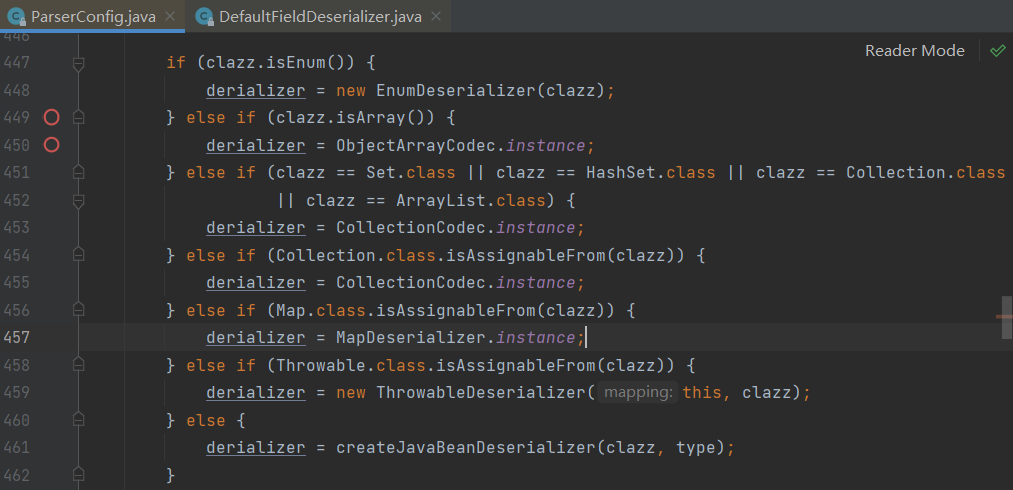 再往上几层跟进到DefaultFieldDeserializer的parseField方法,根据不同的fieldValueDeserilizer值通过deserialze反序列化获取属性的值。而fieldValueDeserilizer的值又是从ParserConfig的getDeserializer方法获取,在这个方法里,数组类型的属性会返回ObjectArrayCodec实例的derializer。ObjectArrayCodec会像调用栈所示那样,对数组类型属性的base64值解码还原。