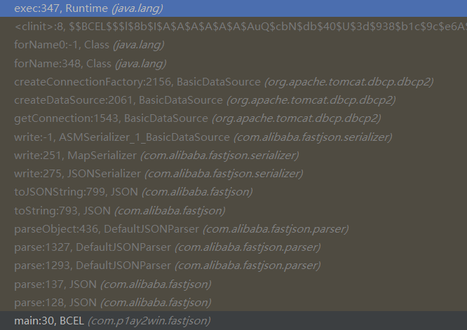 以下是一个加载恶意类,而恶意类静态代码中有写了Runtime弹计算器的POC,老样子在exec方法处下断点,发现调用栈还是比较钱的,可以从开头开始分析。
