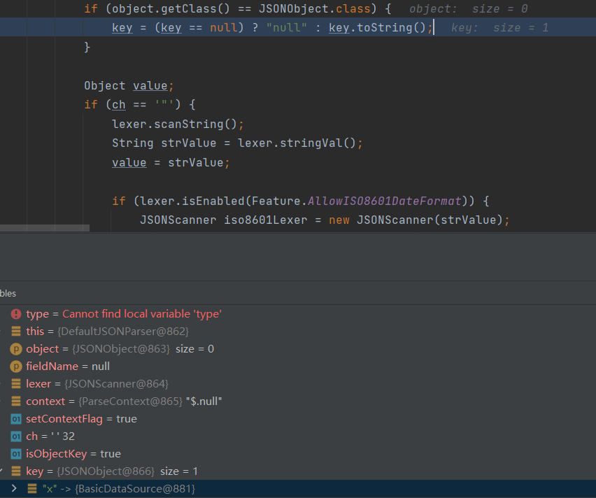 直接跟进到com.alibaba.fastjson.parser.DefaultJSONParser#parseObject,当反序列化的对象为JSONObject时,会调用键的toString方法。此时的键是键为x,值为BasicDataSource对象的JSONObject对象。