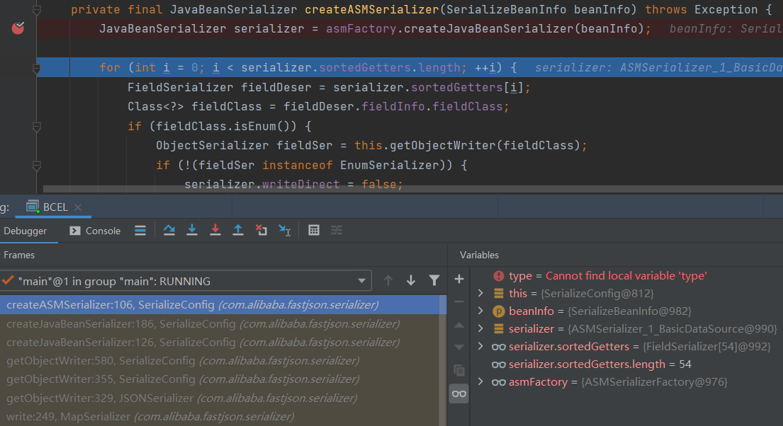 回到com.alibaba.fastjson.serializer.MapSerializer#write调用serializer属性的getObjectWriter方法处跟进,发现最终调用的是com.alibaba.fastjson.serializer.SerializeConfig#createASMSerializer,ASMSerializerFactory工厂类生成了BasicDataSource的ASMSerializer专属子类ASMSerializer_1_BasicDataSource。