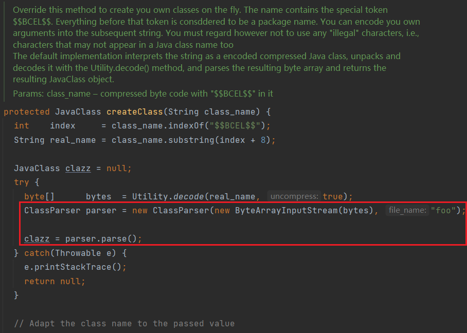 此时的loader是BCEL的ClassLoader,这是一个神奇的ClassLoader。当反射的类名是$$BCEL$$开头时,会将类名剩余部分解码作为输入流,解析并返回一个Class实例,那么恶意类的静态代码中的恶意代码就会被执行。