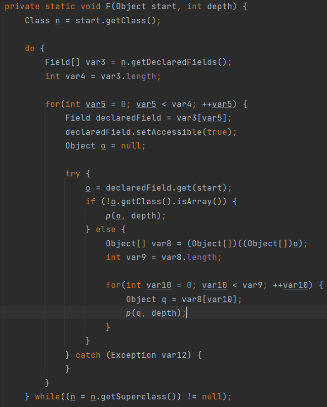 在看看tomcat的回显,代码稍长,利用的是c0ny1师傅提出的一种方法,深度优先搜索遍历当前线程的所有属性找到request和response,是tomcat上一种较为通用的回显方法。详细的分析可以在c0ny1的文章:半自动化挖掘 request 实现多种中间件回显中看到,这里就不展开说。