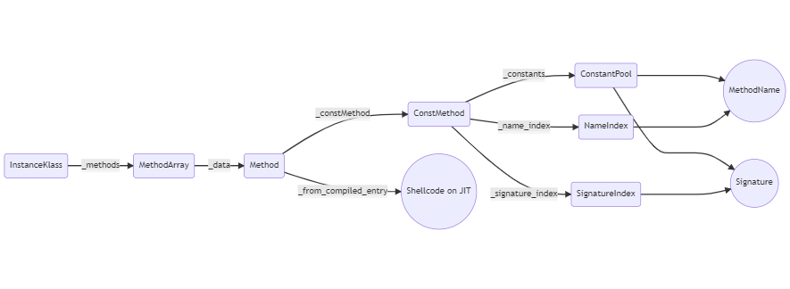 然后通过InstanceKlass、Array<Method*>、Method、ConstMethod、ConstantPool、Symbol这些oop数据结构中的变量偏移计算出JIT的地址。