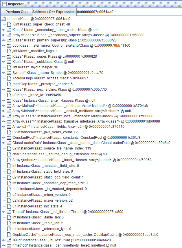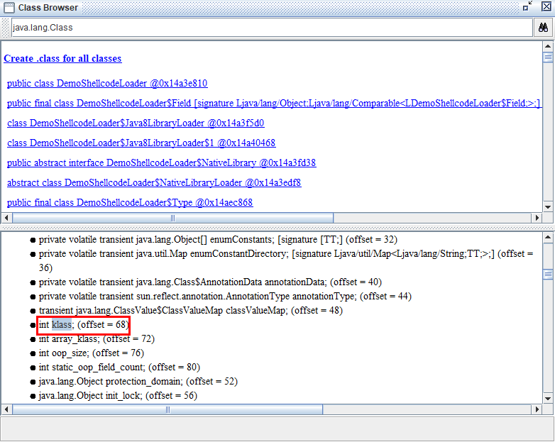 笔者在JDK7也曾尝试注入shellcode,但最后还是以失败告终,不仅是因为JDK7到JDK8的oop数据结构发生了很大的变化,而且JDK7中的类示例中并没有InstanceKlass结构成员,但java_lang_CLass中又确确实实存在_klass_offset这个结构成员,这点就比较奇怪。