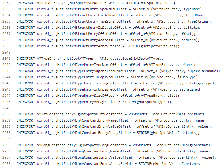 在JVM的本体:jvm.dll和libjvm.so中,存在这一个VMStructs的类,存储了JVM中包括oop、klass、constantPool在内的数据结构和他的属性。其中有使用JNIEXPORT标记的VMStructs、VMTypes、IntConstants和LongConstants的入口、名称、地址等偏移的变量,借助ClassLoader的内部类NativeLibrary的find或findEntryNative方法(与JDK的版本有关),可获取到这些变量的值。